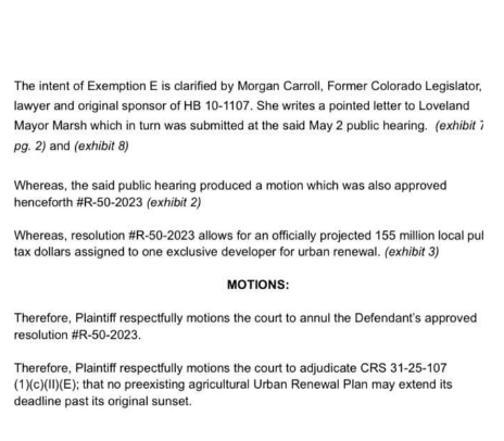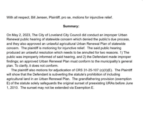 Jensen: I want Colorado Law enforced, to stop agricultural land included into an Urban Renewal Plan. I’m seeking that City Resolution #R-50-2023 annulled. I’m also seeking “exemption E” adjudicated to mean that a preexisting agricultural URA may not have its original sunset extended. One sunset only. Indeed, The Defendant’s interpretation and application of Exemption E is without basis, as it renders the complete statute fruitless.